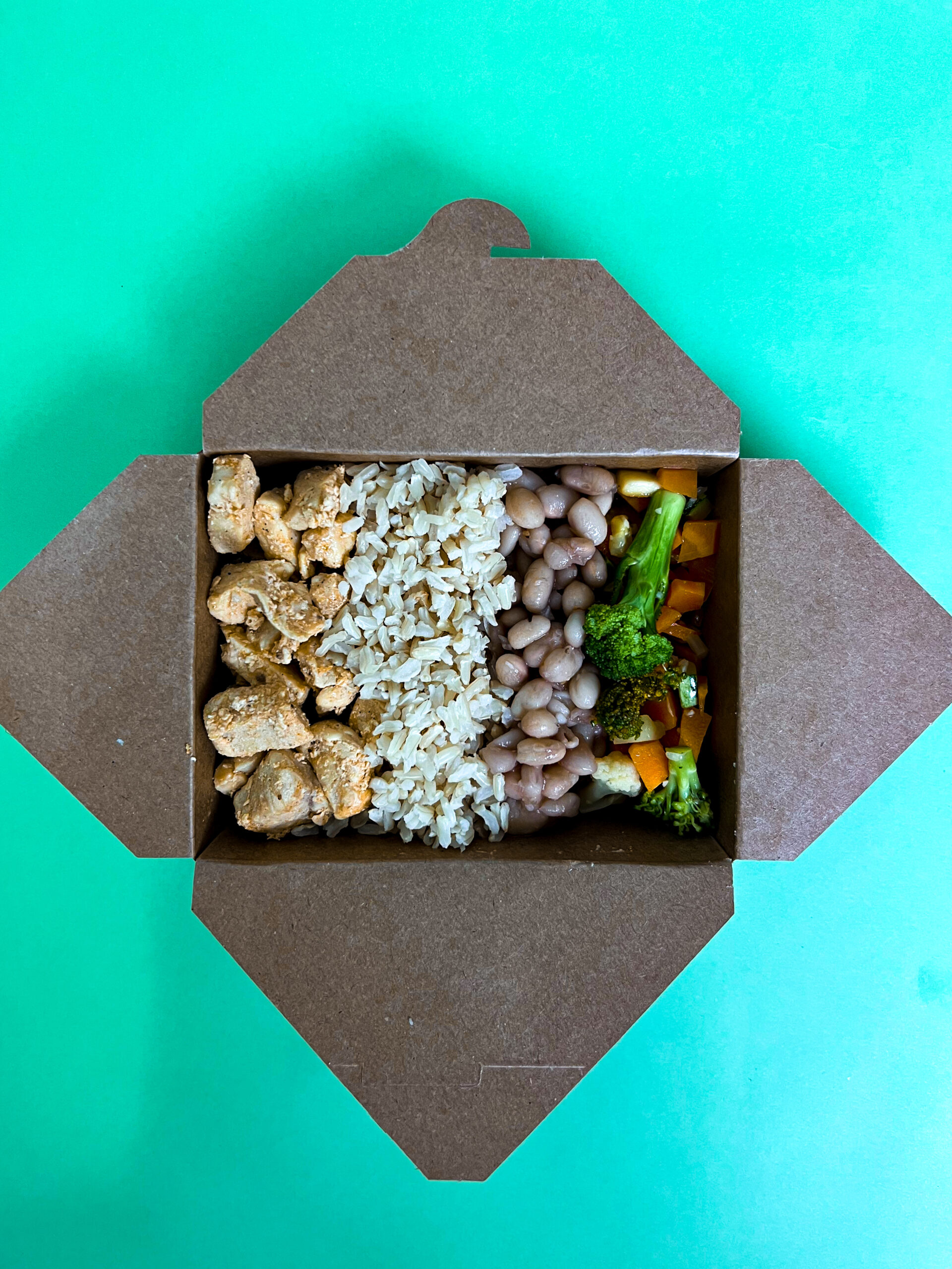 Peito de frango, Molho de tomate natural, Arroz integral, Feijão carioca, Cenoura, Abobrinha, Brócolis, Azeite de oliva, Temperos naturais.